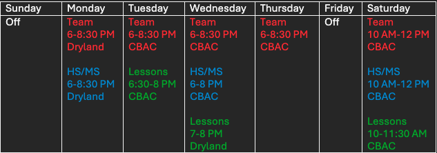 Here is our practice schedules for each group this fall! The Spring Schedule will be for March through the end of May - we will update the schedule again towards the end of May for the summer.